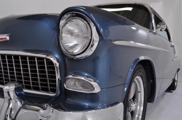 The car features only subtle body modifications. The V butt windshield, the custom grill, and flush mounted turn signals are what stand out initially. But a closer look reveals smooth custom fabricated removable side panels as well as a one piece clamshell hood. Even the headlights were cut down and fitted lower on the front fenders……READ MORE